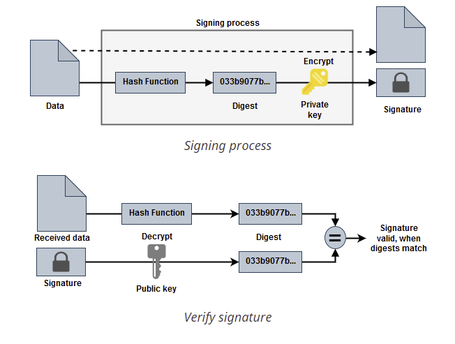 - 원래 문서의 내용을 Data라고 하고, 해당 Data를 Hash 함수(ex, SHA256)를 이용해 Hash된 Data(Digest)를 만듬