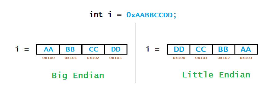 - 예를 들어 32비트 정수 12345678을 저장하는 경우 빅엔디안은 0x78 0x56 0x34 0x12로 저장하고, 리틀엔디안은 0x12 0x34 0x56 0x78로 저장합니다.