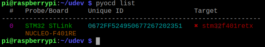 이후, ST-LINK와 연결된 USB를 재 연결 하고 pyocd list 명령을 수행하면 아래와 같이 장치가 인식 된 것을 확인 할 수 있다.