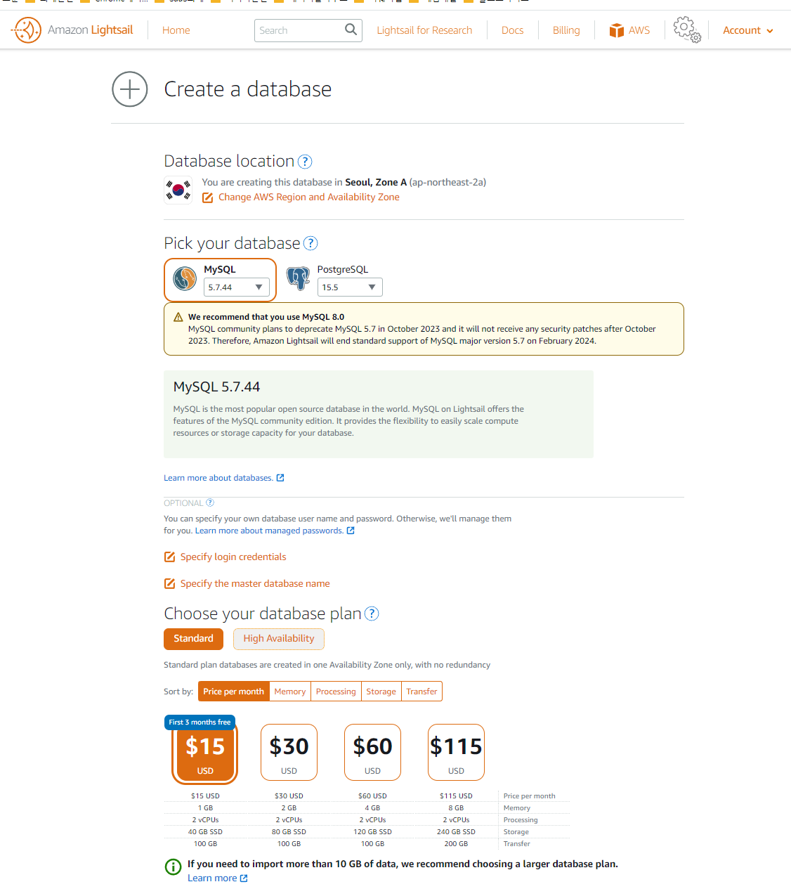 가이드 문서에 나온대로 MySQL DB를 선택 하였으며, 버전은 5.7.X 버전을 사용하였습니다.